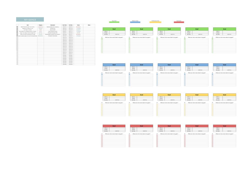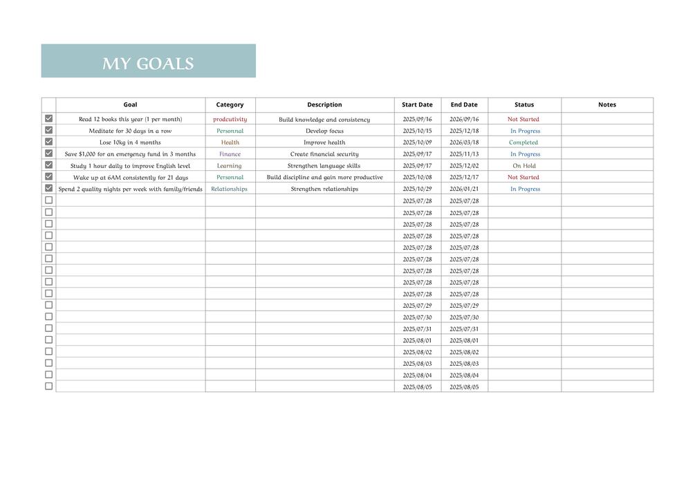 ✔️ Goal Table for Clarity – Organize every goal with Goal, Category, Description, Start Date, End Date, Status so you always know where you stand.